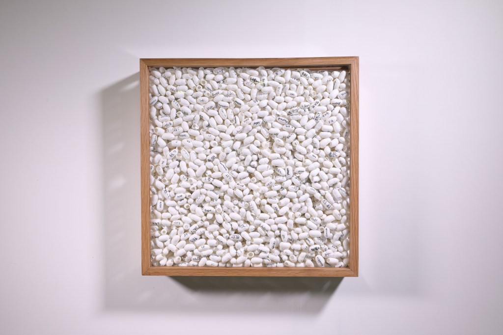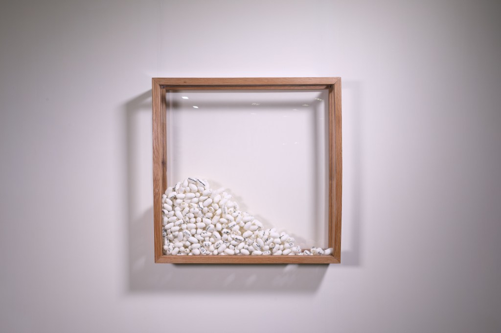 What is most striking is how both artists interpret the idea and feeling of home as subject to change. Cam Xanh uses two of Vietnam’s famous Declarations of Independence—the 10th century poem Nam Quốc Sơn Hà (Mountains and Rivers of the Southern Country) declaring independence from the Chinese, and the 1945 speech from Ho Chi Minh decrying the French and Japanese occupation—to demonstrate the instability of the geopolitical borders that define countries. Whilst both the poem and speech reference the physicality of “our” land for which they are fighting, it is the emphasised emotional connection that makes it worth fighting for. Cam Xanh mounts her work to reflect the arbitrariness of these borders. The cocoons featuring the Vietnamese, French and Japanese translations of Ho Chi Minh’s 1945 speech that resulted in the division of North and South Vietnam stand stoically in two large square boxes—a reminder of the past and its historical influence on the present. Likewise, the smaller, single box containing the poem considered to be Vietnam’s first Declaration of Independence is just one of an unlimited edition. Small though it might be, it suggests an unfinished fight and has significant implications for Vietnam’s, as well as other previously occupied countries, continuing fight for autonomy and dominance in an increasingly globalised, still Western-led world. As a material the silk cocoon is strong despite being very fine, when unravelled it is almost invisible and yet one cocoon contains nearly one kilometre of thread. Like the silkworm, Southeast Asia has a history of being exploited but just as silk exports once played a major role in supporting the region’s economy, Cam Xanh uses the silk cocoon as a symbol to reflect countries such as Vietnam and Taiwan’s ever-expanding reach and presence on the world stage. The pieces’ varying appearance, as the cocoons are jostled in their boxes by the movement of each installation, only further demonstrates the passing of time and its accompaniment of unrelenting change.