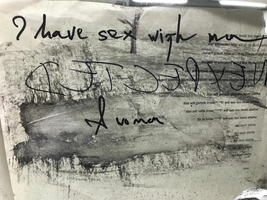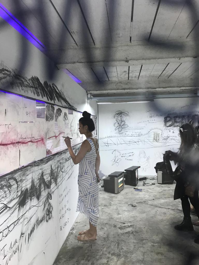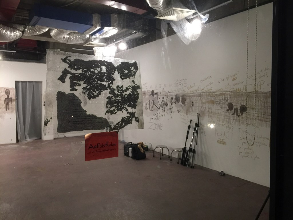 in an echo of the initial performance, some artists began to draw with charcoal on the walls. this action was extended in the performance’s second occurance to drawing on the windows with lipstick and markers also. artists used the paper articulations of the freedom of expression manifesto to cover the windows, further nullifying the audience’s experience and amplifying the performances’ differences.
