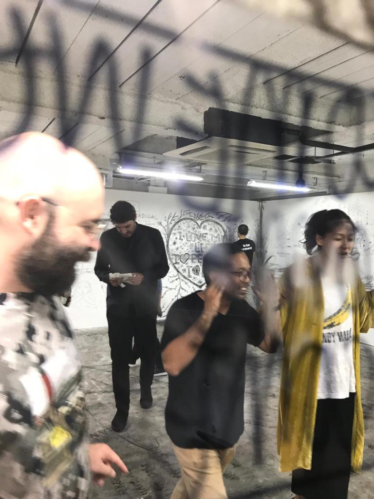 nine participants took part in the performance: four MoT+++ collective, four guest artists, including an art technician-cum-artist, and one curator. only participants were allowed in the room, with audience members restricted to watching through eye-level windows, unable to distinguish the murmurings inside. the purpose-built room was located adjacent to the S.E.A. Spotlight Talks, where industry and artists panels and talks were staged throughout the fair from January 24-27.