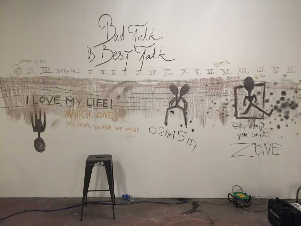 by gathering artists in a room to talk but removing their audience, the performance questions the very concept of the “artist talk”, and the obtuse nature of “talk” itself. in requiring artists to continually vocalise their internal dialogues, it turns the thought inside out, and asks whether they really have something to say or if it’s just talking for the sake of talking. a three-channel video, with footage of previous talk, was installed in the room creating a clamour of constant noise. the multiple harmonies and dissonances of audible layers formed from this orchestra of incessant talk giving artists a platform to speak freely from cultural or political censorship, whilst simultaneously eradicating the possibility for them to be heard.