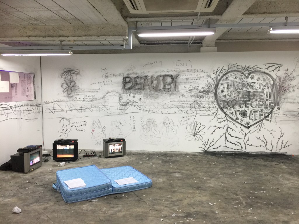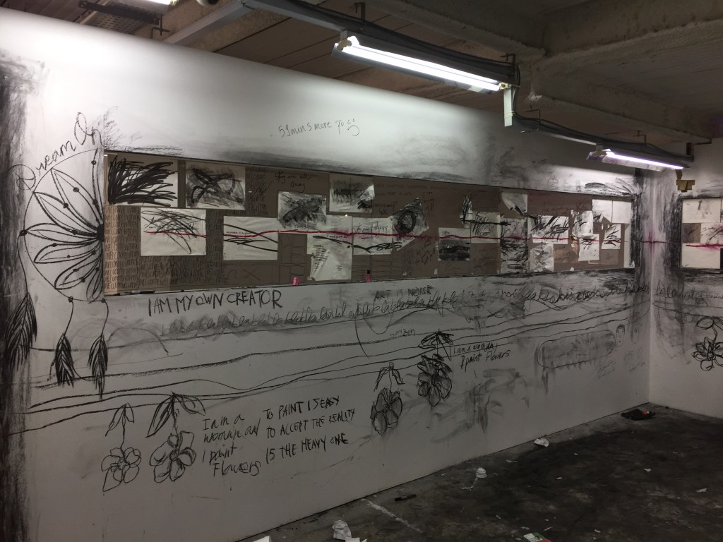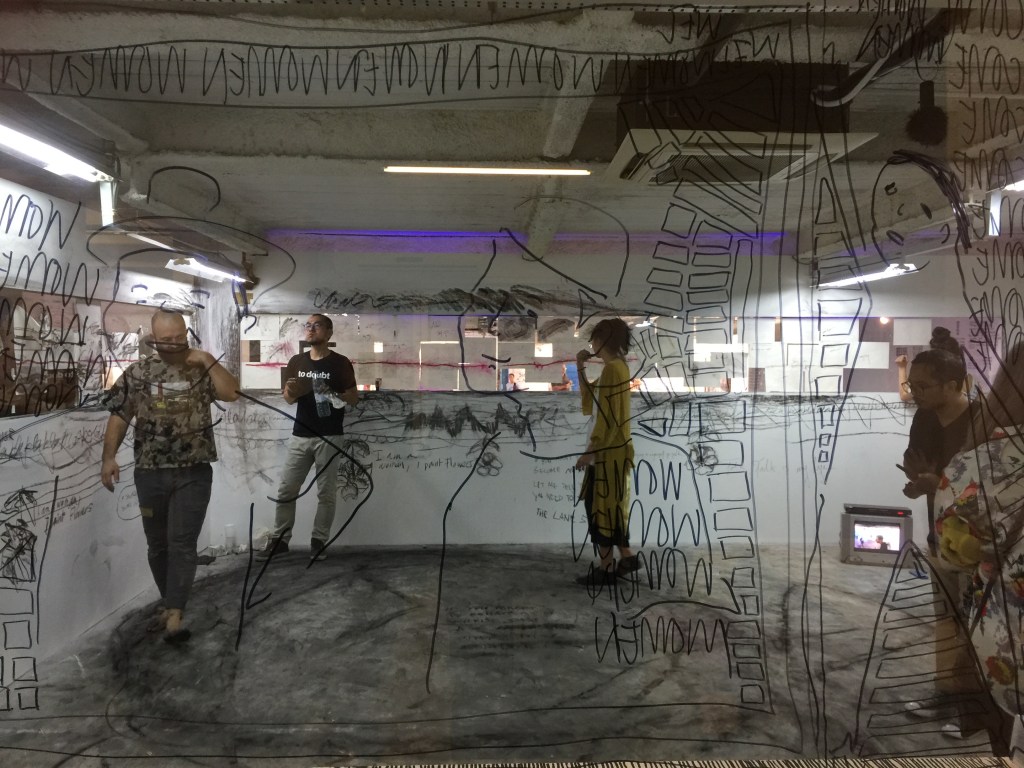 after two hours participants were allowed to exit. the resulting room was left for the remainder of the fair: filled with drawings, writing and other marks, dialectical discourses of the first performance still continuing in the corner.