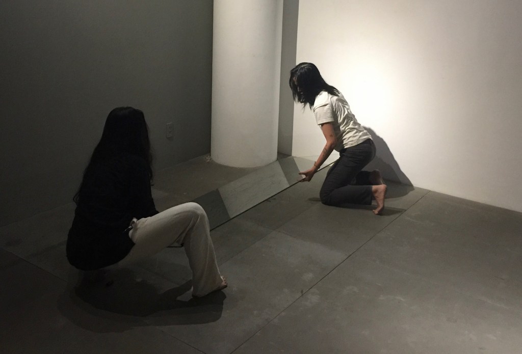 over the course of 58 minutes Cam Xanh made her way around the MoT+++ main gallery space as if levitating, using two small silver stool only as stepping stones. each step to the next stool came with a 180 degree rotation, where the artist would alternate between facing the wall and facing the room. between this action she marked the wall above her head with either the number 0 or 1 respectively, using in an almost imperceptible white pen. the performance took place in the dark and she wore a wedding dress covered in rhinestones that glittered in the audience’s phone flashlights and outside light sources entering the space through the windows.