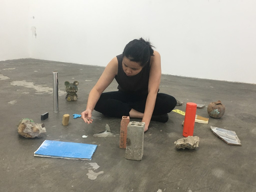 objects used: rocks, bricks, construction rubbles, aluminium foil, rubber band, map of vietnam, found mouse sculpture, chalk, mirror shards