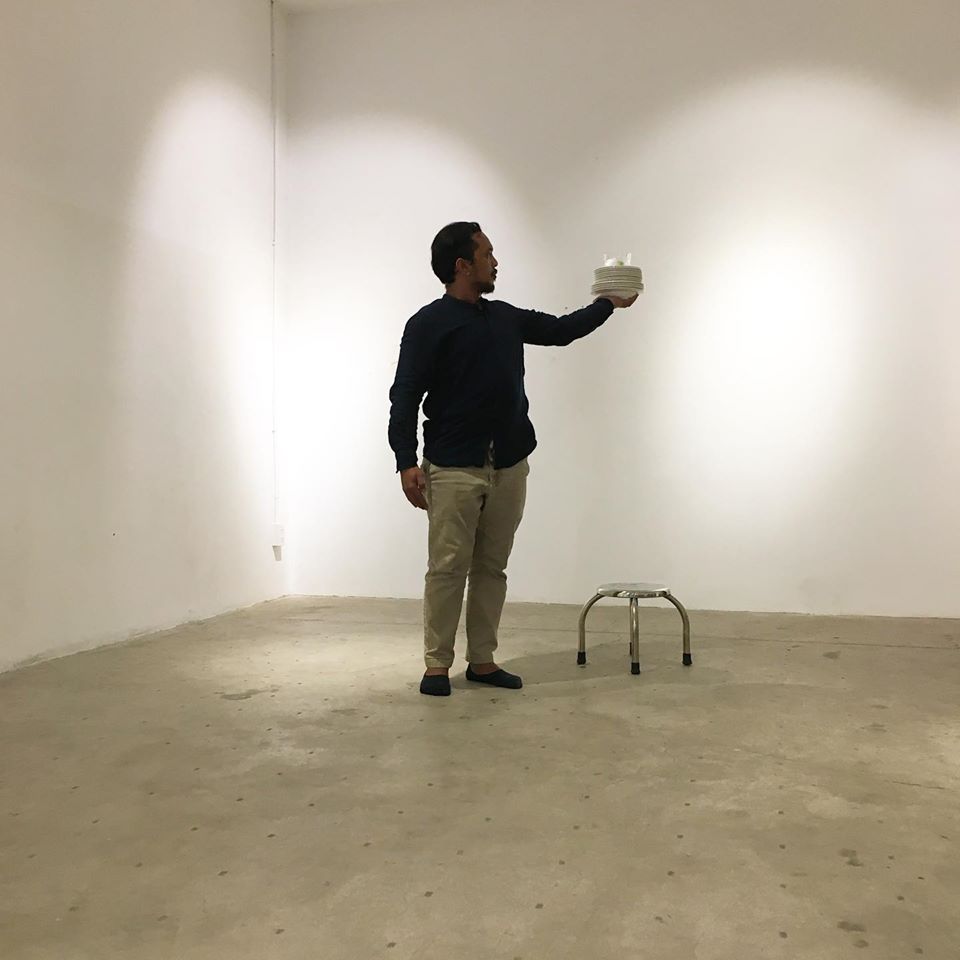 for his performance Aliansayah grappled with the weight of holding a full glass of water, with one small leaf floating inside, on a small stack of bowls in one hand. for thirty minutes he attempted to keep the stack raised to head level and arm’s length in a fruitless attempt not to spill any water. both sweat from the artist’s brow and water from the cup spilt onto the floor over the course of the performance, as the artist struggled to keep the stack raised, transferring it from one hand to the other when the weight became too much. placing the stack down again, Aliansayah contemplated it briefly before kneeling and placing his head on the floor. the sweat from his forehead and face marked the concrete, darkening areas with its wetness until those spots were indistinguishable from those made by the spilt water.