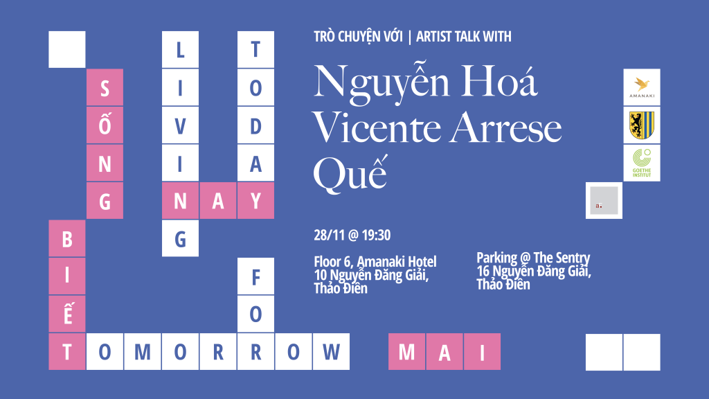 Join us for an artist talk on November 28 at 7:30 PM with artists Nguyễn Hoá, Vicente Arrese, and Quế. This event marks the conclusion of their residency and group exhibition, “Living, Today for Tomorrow.”