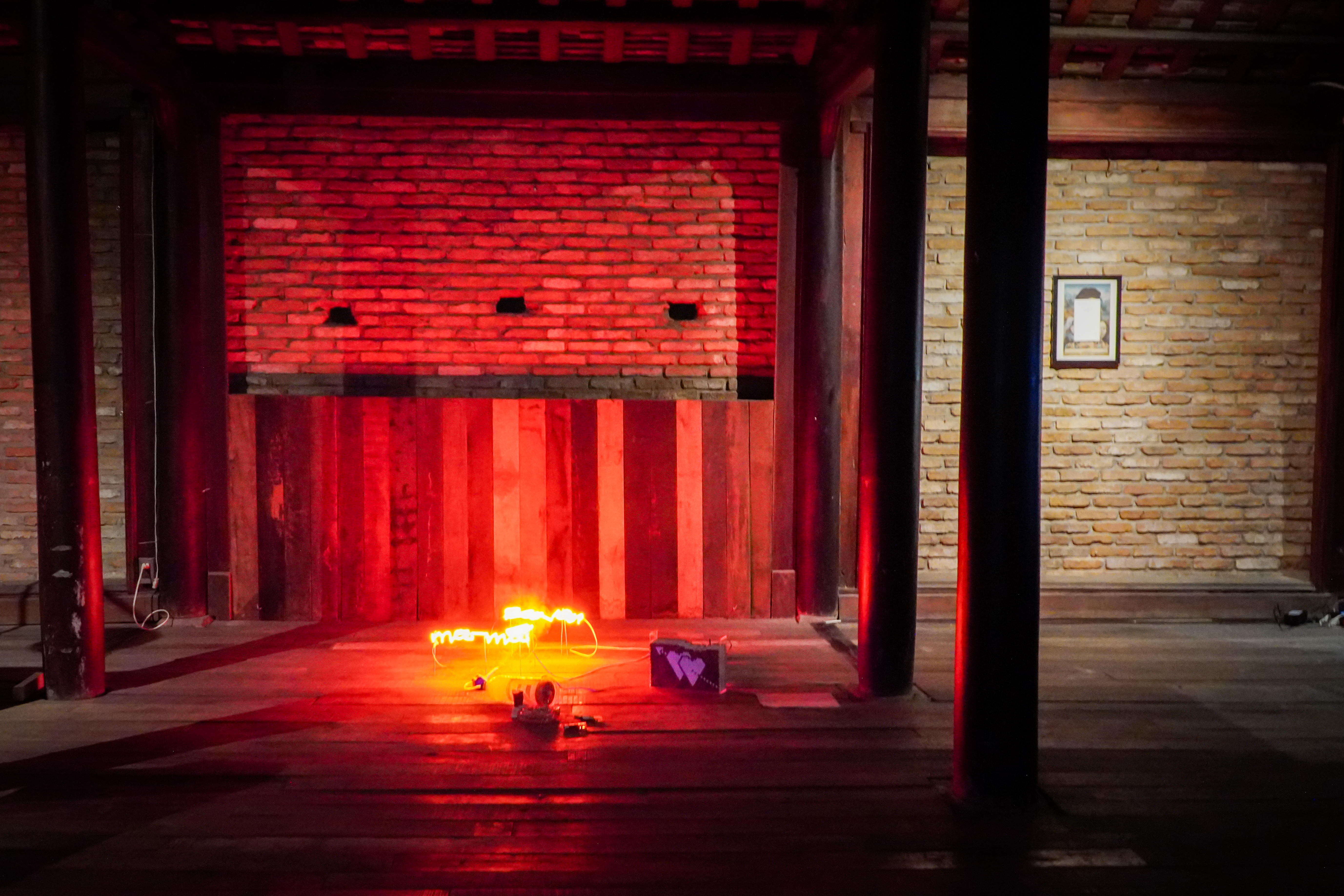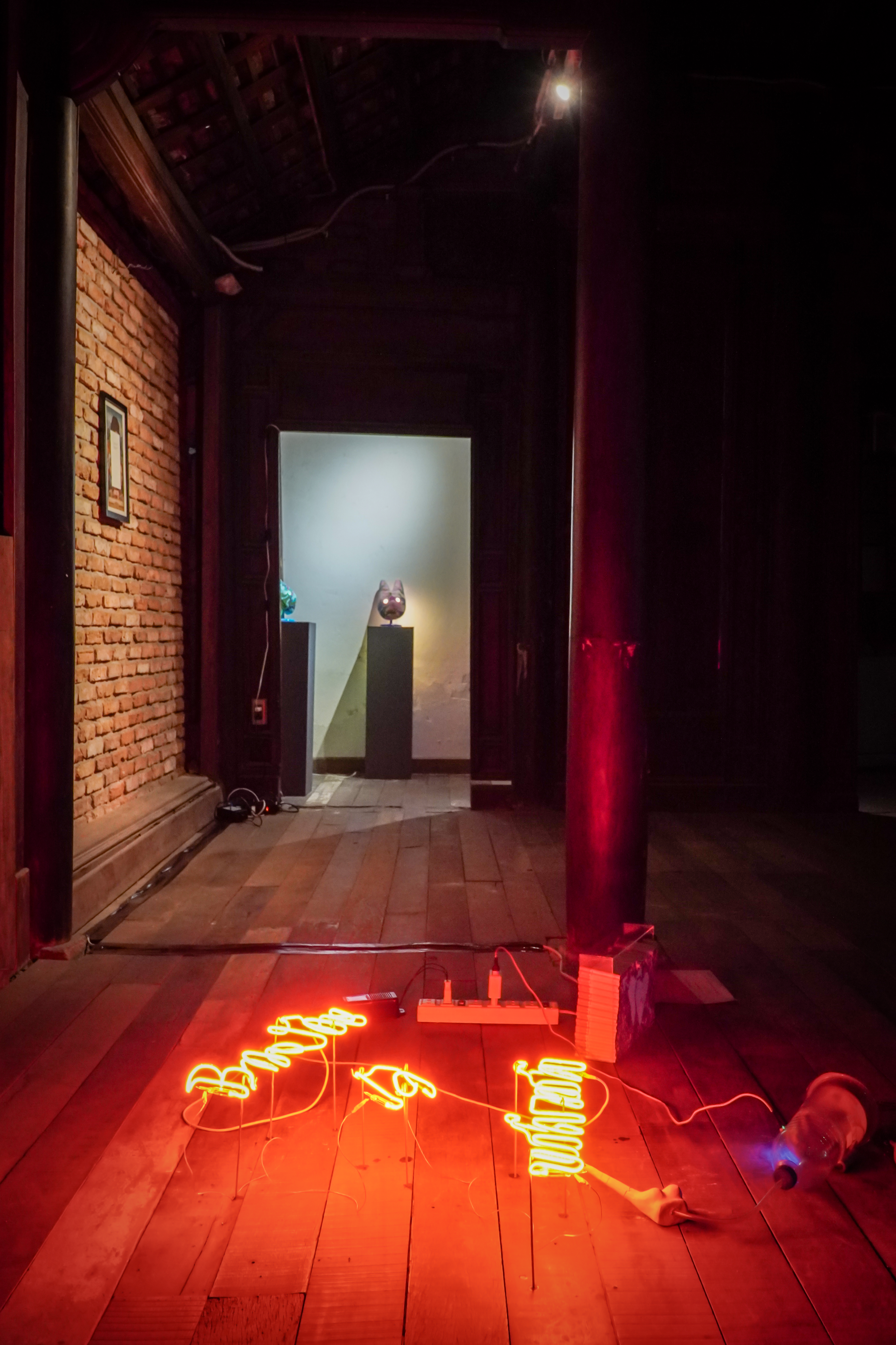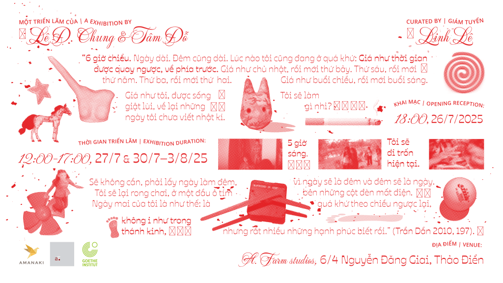A. Farm và Viện Goethe Thành phố Hồ Chí Minh hân hạnh được giới thiệu triển lãm đôi của Lê Đ. Chung và Tâm Đỗ với tựa đề 6 𝓰𝓲ờ 𝓬𝓱𝓲ề𝓾. 𝓝𝓰à𝔂 𝓭à𝓲. Đê𝓶 𝓬ũ𝓷𝓰 𝓭à𝓲. 𝓛ú𝓬 𝓷à𝓸 𝓽ô𝓲 𝓬ũ𝓷𝓰 đ𝓪𝓷𝓰 ở 𝓺𝓾á 𝓴𝓱ứ:.., do Linh Lê giám tuyển. Một cử chỉ khép lại thời gian lưu trú kéo dài ba tháng của hai nghệ sĩ, triển lãm được dựng lên từ một tổ hợp những mảnh nghĩ ngợi của cả hai về ý niệm thời gian, được họ vun vén một cách đầy bản năng, kèm theo một liều lượng lớn của sự tinh quái hiện diện qua cách họ sử dụng chuyển động, các đồ vật hay là những biểu tượng và kỷ vật đặc thù cho từng thời kỳ. Đúng thực là một khái niệm tạo nên bởi con người, thời gian trong trường hợp này bị kéo dãn, đâm thủng và gấp lại tuỳ ý để dành chỗ cho những suy đoán và mơ tưởng. Tác phẩm của Lê Đ. Chung giải phẫu cái gọi là mãi mãi bằng nỗ lực gợi lên cảm giác, những hứa hẹn (hoặc thất bại của những hứa hẹn), và câu hỏi liệu rằng mãi mãi sẽ mãi luôn tồn tại hay nó chỉ ngụy trang trong sự lặp lại miên viễn của những hình mẫu. Song song đó, Tâm Đỗ giải phóng nữ anh hùng cách mạng cùng với những hiện vật riêng tư giờ đây đã trở thành lịch sử khỏi bốn cạnh vuông vức của hộp kiếng tưởng như trong suốt trong bảo tàng, rồi đặt để những câu chuyện trong một bối cảnh khác đoạn tuyệt khỏi những trần thuật lớn lao và mục tiêu của ý thức hệ.
