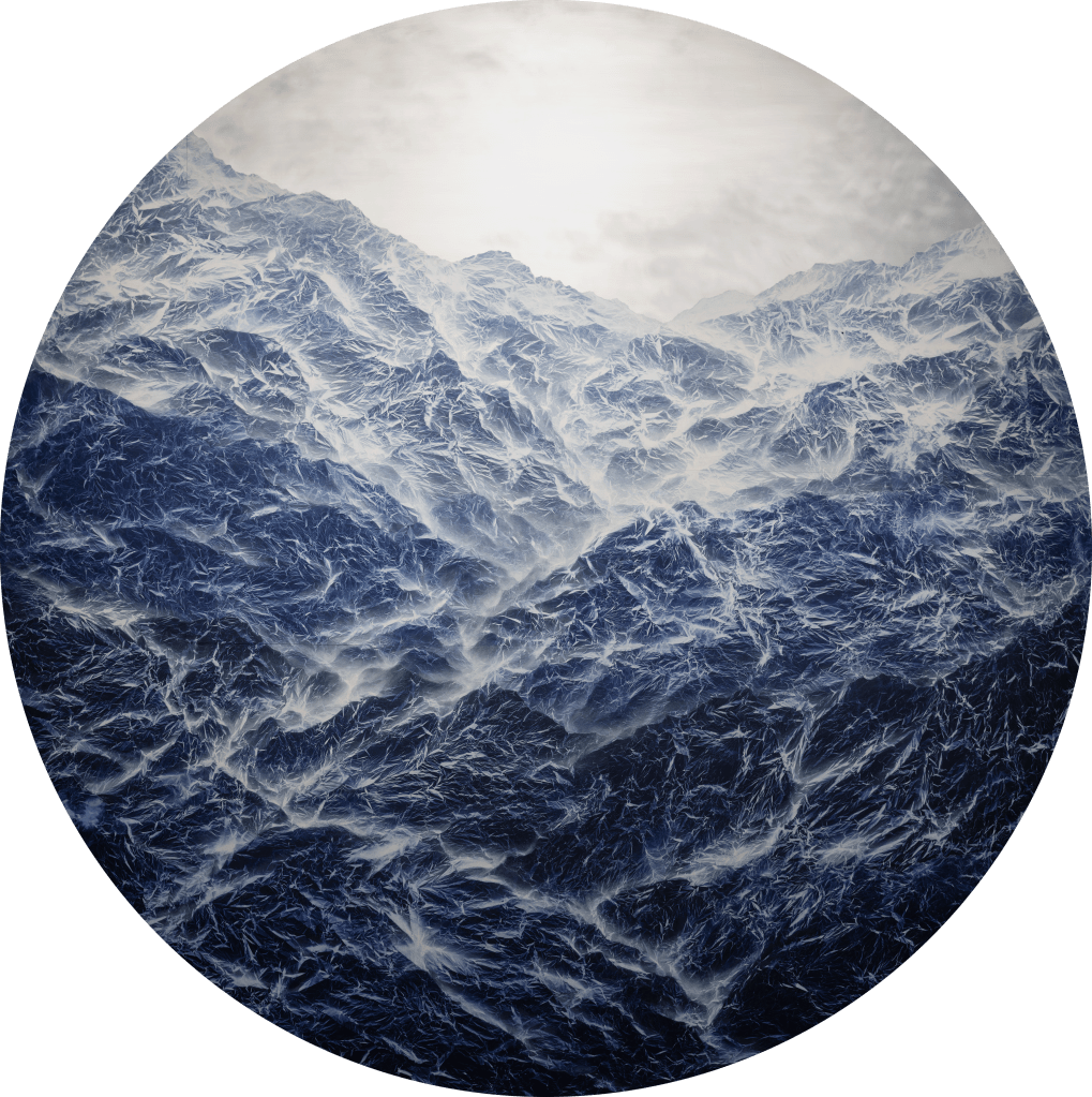 Cyano-Collage 121/2021/Cyanotype photography, Xuan paper, acrylic gel, acrylic, mounted on aluminum board/ 360 x 360 cm round/ Collected by Vero Beach Museum of Art